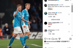 本场比赛德布劳内替补登场,赛后他也在社媒晒出与进球功臣霍伊伦合照,配文写道:“当对手想从客场拿走我们三分的时候☝️”