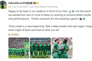 很高兴回到我们的主场,在球迷们面前征战🙏💚。尽管没能拿到想要的结果,但现在我们必须继续努力,拿出更好的表现、争取更理想的成绩。感谢所有人给予的鼎力支持💪🏿💚。