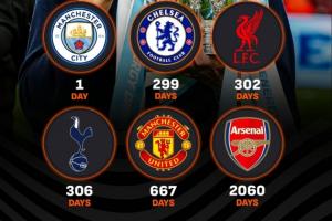 英超六强上次赢得重要奖杯至今的天数(未计入社区盾):