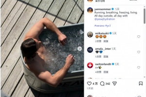 体育资讯3月30日讯 国米门将索默更新社媒动态,晒出在瑞士泡冰浴的照片。
