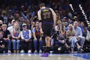 GIF-东契奇受伤倒地捂着后侧大腿
