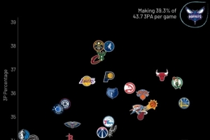 横轴-三分总出手数;纵轴-三分命中率;黄蜂场均出手43.7次&命中率为39.3%